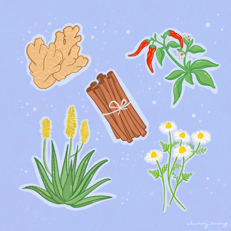 Digital drawing of ginger, cinnamon, cayenne pepper, aloe vera, and chamomille for news article, “Herbal Medicine” on CNY Latino Newspaper.